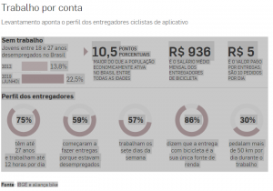“Uma parte desses entregadores são os jovens que tentam ingressar no mercado de trabalho desde 2014, mas enfrentam dificuldades com a crise”, afirmou o economista Eduardo Zylberstajn, do departamento de pesquisa e inovação da Fundação Instituto de Pesquisas Econômicas (Fipe). “Uma crise tão prolongada deixa cicatrizes, e o desemprego entre os jovens talvez seja a maior delas.”