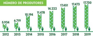 Em 2012, havia no país quase 5,9 mil produtores registrados e março de 2019, já registrou mais de 17,7 mil, crescimento de 200%. No período também cresceu o número de unidades de produção orgânica no Brasil, saindo de 5,4 mil unidades registradas, em 2010, para mais de 22 mil no ano passado, variação de mais de 300%.