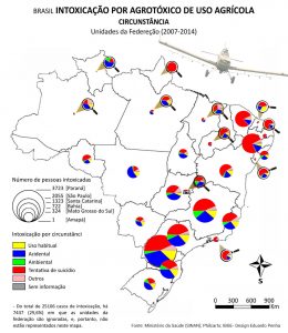 Entre 2007 e 2014, o Ministério da Saúde teve cerca de 25 mil ocorrências de intoxicações por agrotóxicos. O atlas mapeia as regiões mais afetadas: dos Estados brasileiros, durante o período da pesquisa, o Paraná ficou em primeiro lugar, com mais de 3.700 casos de intoxicação. São Paulo e Minas Gerais ficaram na segunda colocação, com 2 mil. Das 3.723 intoxicações registradas no Paraná, 1.631 casos eram de tentativas de suicídio, ou seja, 40% do total. Em São Paulo e Minas gerais o porcentual foi o mesmo. No Ceará, houve 1.086 casos notificados, dos quais 861 correspondiam a tentativas de suicídio, cerca de 79,2%. Os mapas de faixa etária mostram que 20% da população afetada era composta de crianças e jovens com idade até 19 anos. Segundo Larissa, no Brasil, há relação direta entre o uso de agrotóxicos e o agronegócio. Em 2015, soja, milho e cana de açúcar consumiram 72% dos pesticidas comercializados no País.