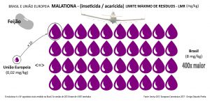 O Brasil é campeão mundial no uso de pesticidas na agricultura, alternando a posição dependendo da ocasião apenas com os Estados Unidos. O feijão, a base da alimentação brasileira, tem um nível permitido de resíduo de malationa (inseticida) que é 400 vezes maior do que aquele permitido pela União Europeia; na água potável brasileira permite-se 5 mil vezes mais resíduo de glifosato (herbicida); na soja, 200 vezes mais resíduos de glifosato, de acordo com o estudo, que é rico em imagens, gráficos e infográficos. “E como se não bastasse o Brasil liderar este perverso ranking, tramita no Congresso nacional leis que flexibilizam as atuais regras para registro, produção, comercialização e utilização de agrotóxicos”, relata Larissa.